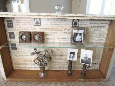 First, it needed something to freshen up the back. I got out my good ol' Mod Podge and attached the pages from some vintage sheet music.