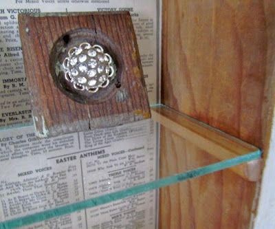 I added a shelf just a little above center. I cut a piece of glass to fit, and then cut and stained a 1/4 round dowel piece to hold up the shelf. That little thingy on the shelf is one of the old rosettes I bought a few months ago. I glued a vintage rhinestone button in the center and put a little hook on back.