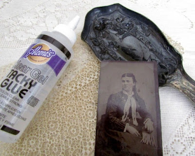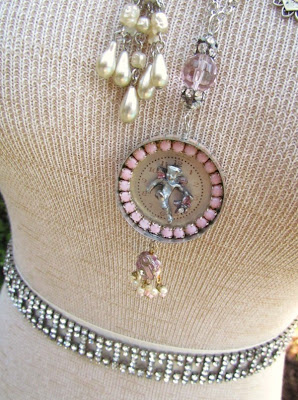 A watch face, pink rhinestones and a cherub from an old bracelet were a perfect fit inside the bottom half of this vintage cold cream tin. I attached part of vintage earring to the bottom of the tin.