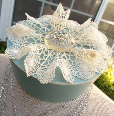 Her neck is now firmly glued in place, so no more mishaps. I painted it with Duck Egg Chalk Paint and then added some lace and a vintage rhinestone button.
