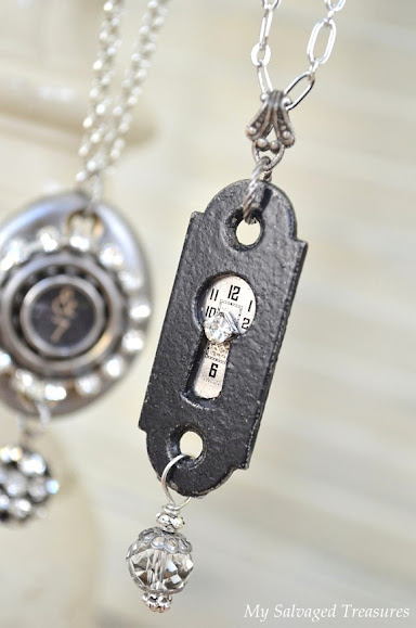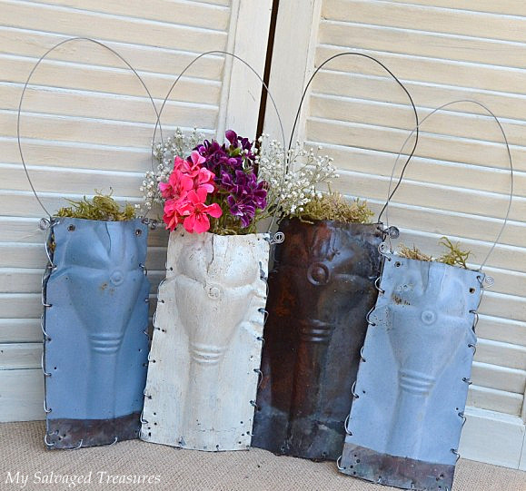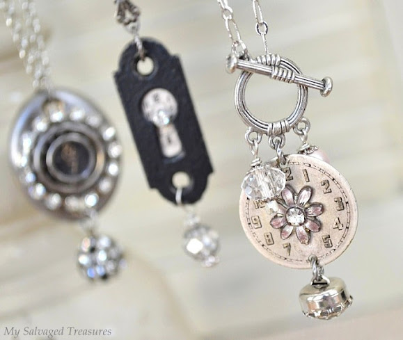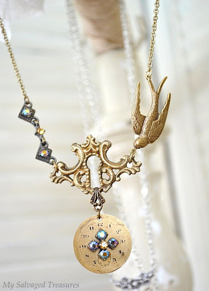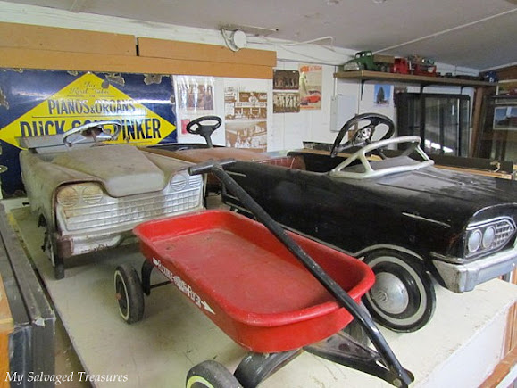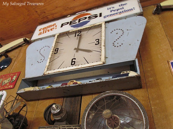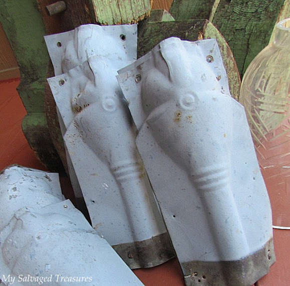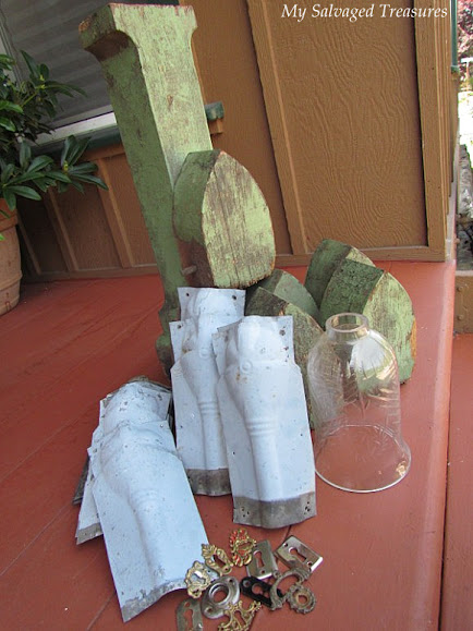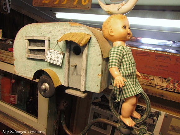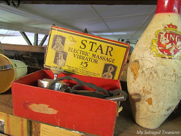 This is what I came home with. Most of these were purchased at two of the antique malls in Jamestown. The old towel holder in the back will be perfect for displaying necklaces, the wooden bucket needs a paint job, and that brush thingie sticking out of it will probably be repurposed. I love the rusty birdcage even without a bottom.