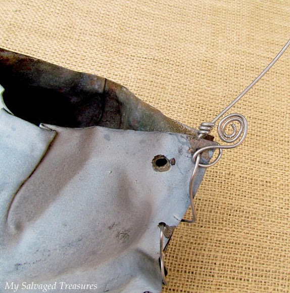 This is upside down to show off the detail. It's a hanging candle holder with chain and a hook attached to the smaller decorate piece on the top left. Hmm, I can see it with moss and a plant.